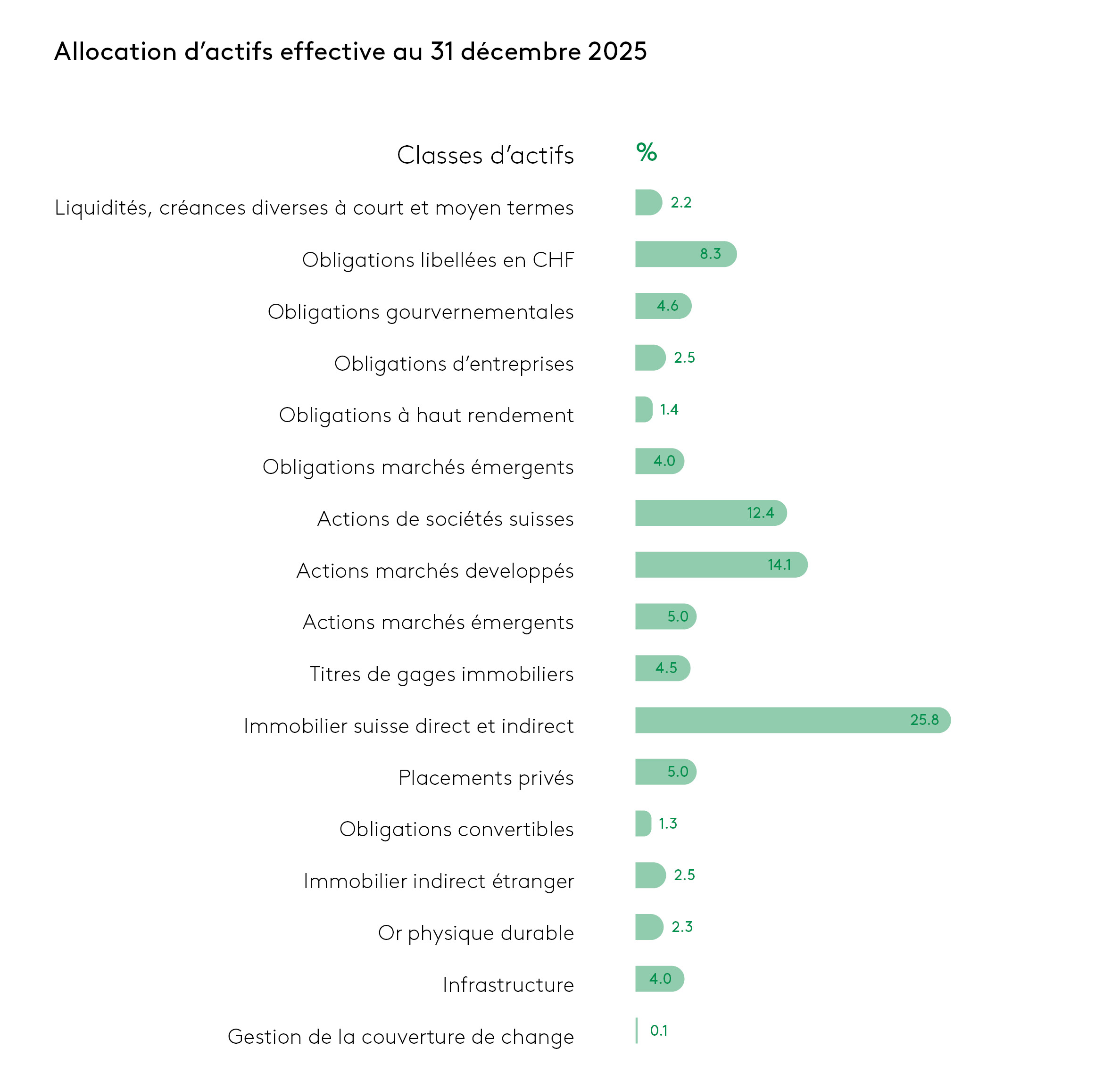 Le portefeuille de placements de la CPEV comprend des investissements répartis dans plusieurs classes d’actifs avec un objectif de diversification optimale. Le choix des investissements est défini par le Conseil d’administration qui tient compte, pour mener à bien sa mission, du risque, des contraintes légales et du besoin de rendement de la Caisse. À la suite d’une étude de congruence actifs-passifs, une nouvelle allocation stratégique, légèrement remaniée, entrera en vigueur au début 2026. La nouvelle allocation est proche de celle précédemment en vigueur. Les principales modifications sont la suppression des obligations convertibles et la réduction des obligations suisses en faveur des actions et de l’immobilier direct suisse.